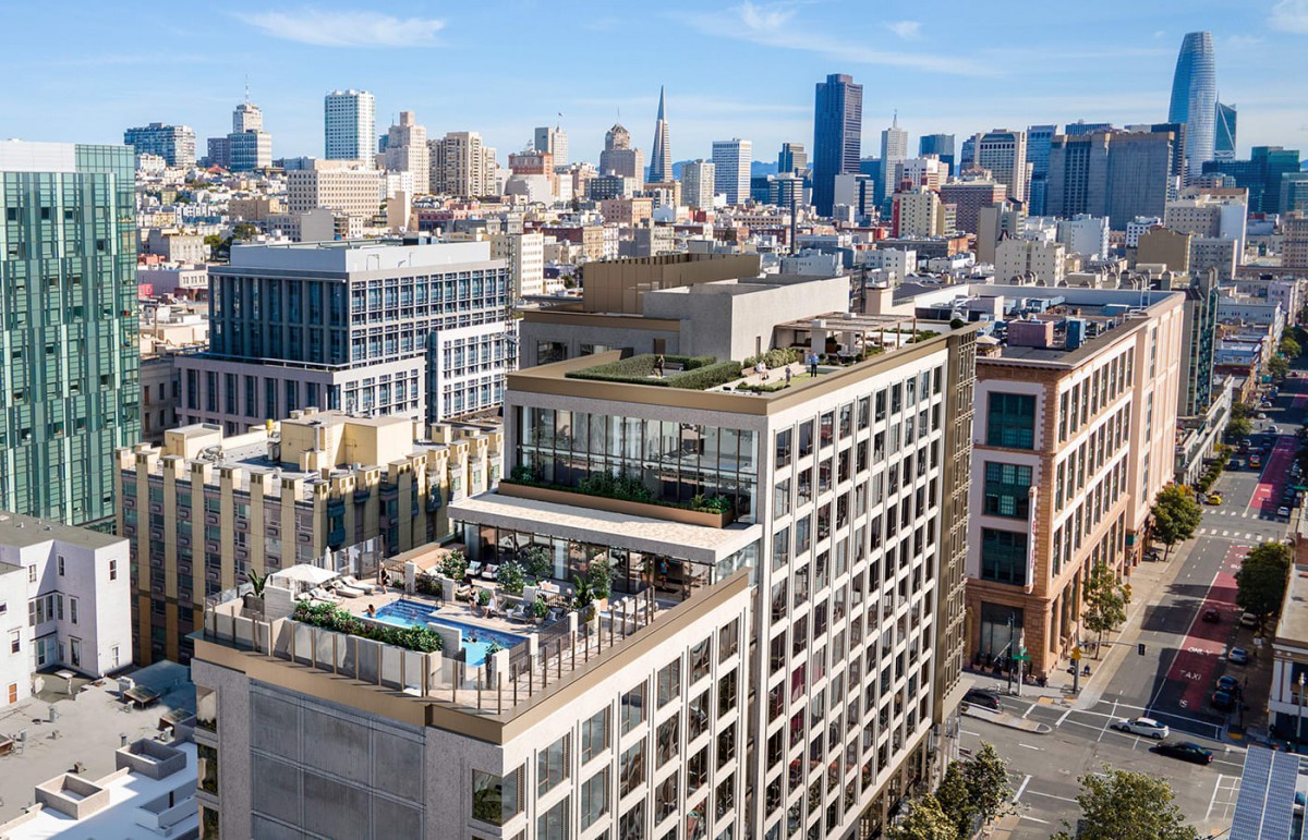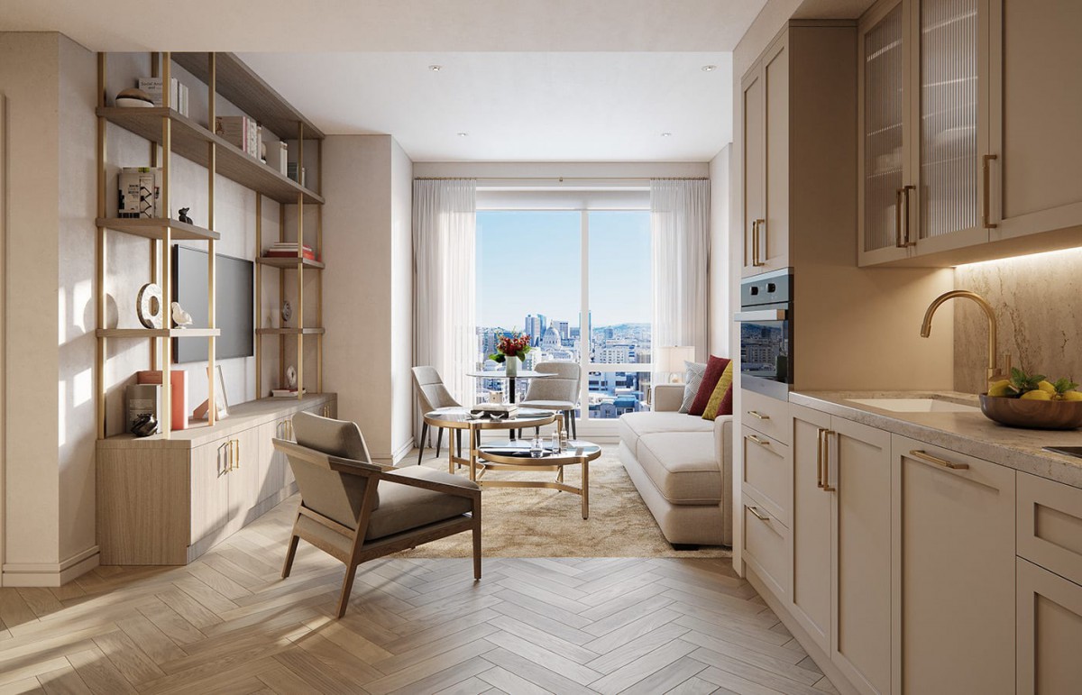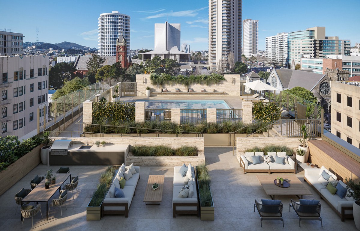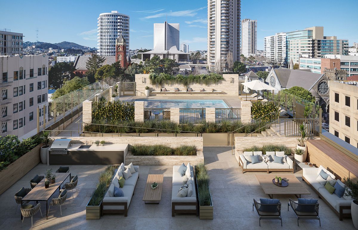 High on San Franciscos Cathedral Hill, Coterie offers refined luxury living steps from the citys cultural heartbeat. The buildings exterior is a mix of glass and stone, echoing modern sophistication. Inside, the style is chic and minimalist with warm Pacific influences: wide-plank hardwood floors, fog-tone furnishings, and local art pieces create an upscale gallery vibe. Common areas include an airy great room with a showcase fireplace, cozy seating arrangements, and high ceilings that expand the space. Floor-to-ceiling windows frame views of the downtown skyline and jutting hills, so even a quiet morning feels luminous. One-, two-, and three-bedroom residences are spacious, with gourmet kitchens featuring stone counters and stainless appliances, and elegant bathrooms with walk-in showers. Balconies or bay windows capture patches of blue sky over fog-kissed rooftops.