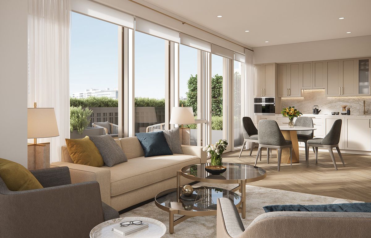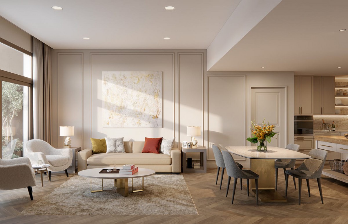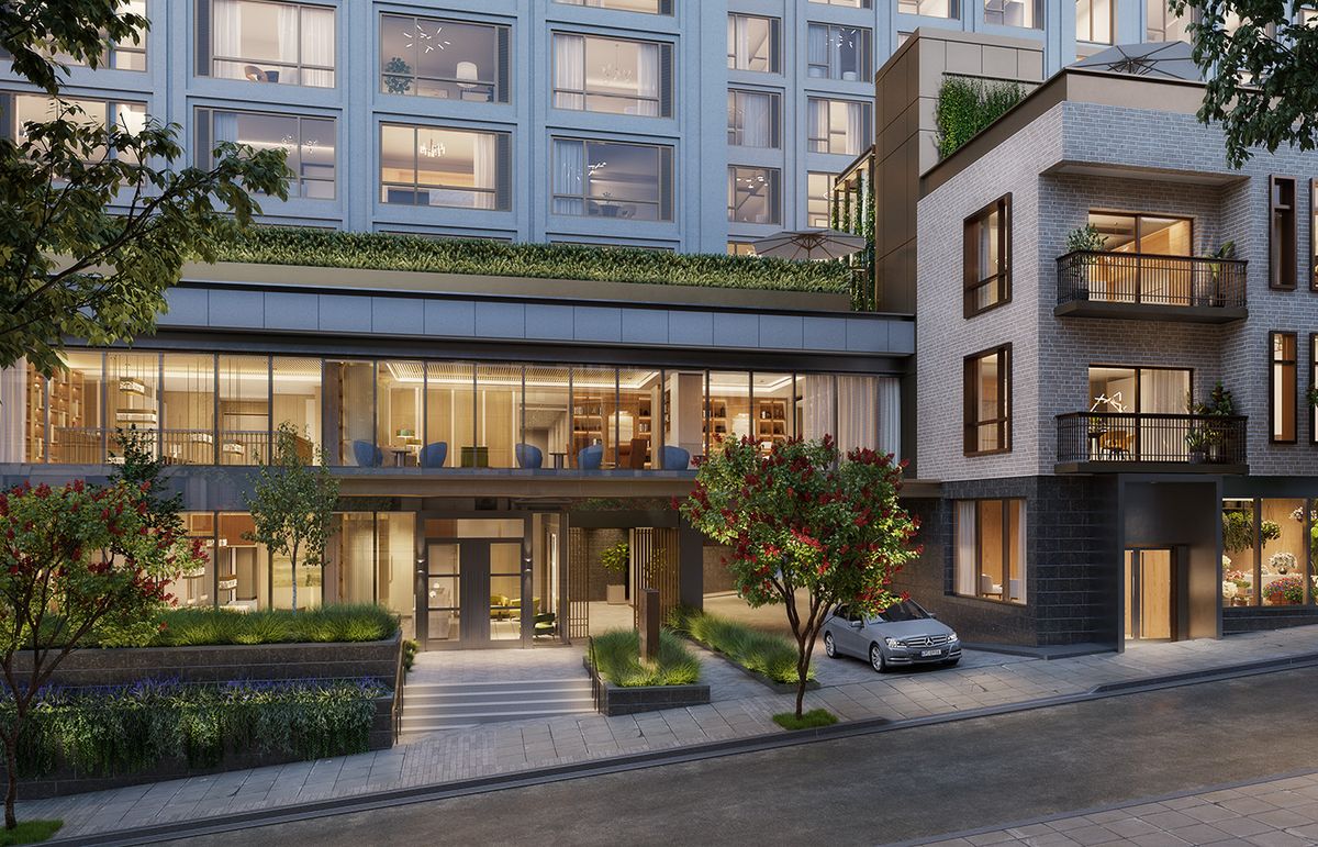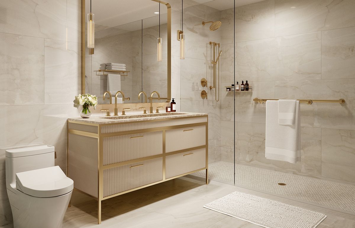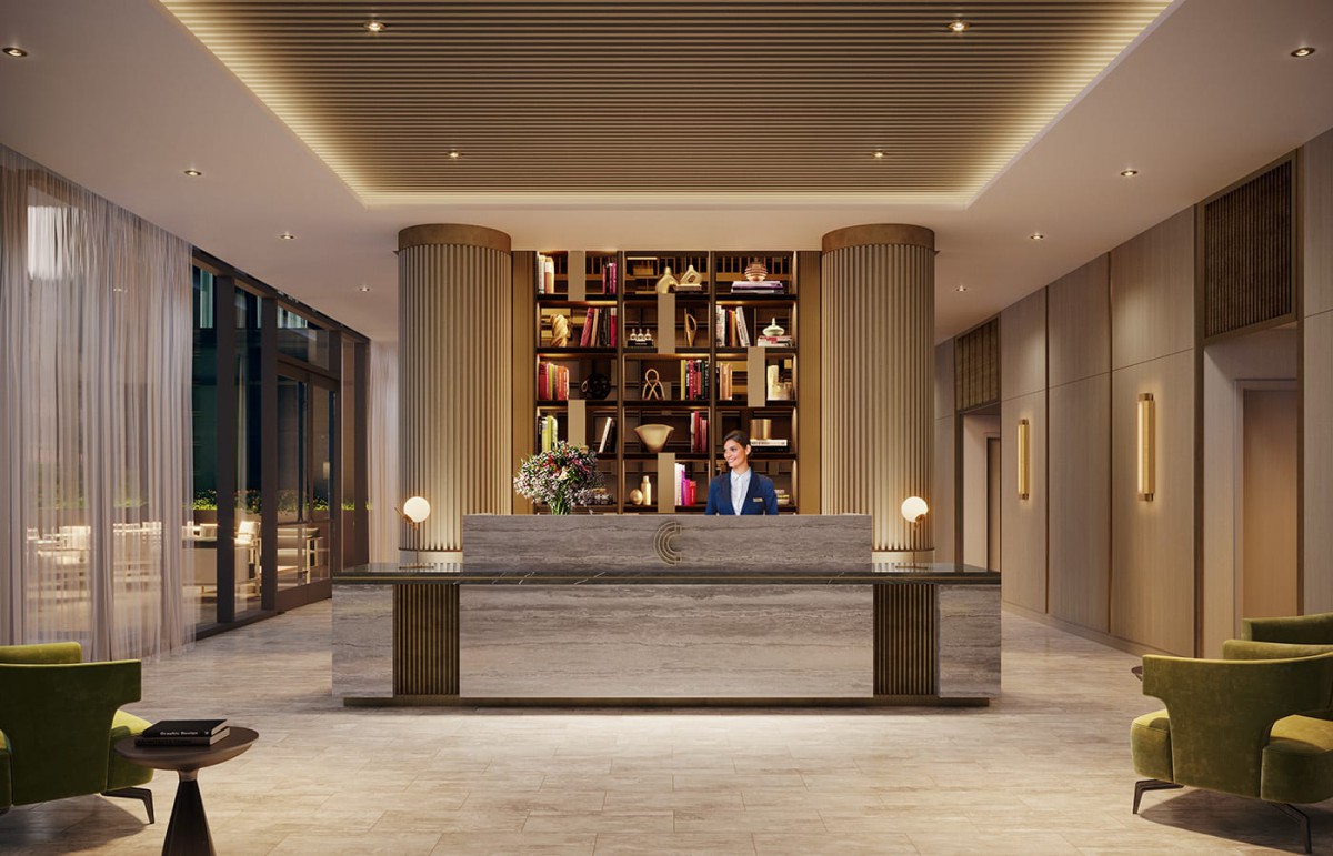 High on San Franciscos Cathedral Hill, Coterie offers refined luxury living steps from the citys cultural heartbeat. The buildings exterior is a mix of glass and stone, echoing modern sophistication. Inside, the style is chic and minimalist with warm Pacific influences: wide-plank hardwood floors, fog-tone furnishings, and local art pieces create an upscale gallery vibe. Common areas include an airy great room with a showcase fireplace, cozy seating arrangements, and high ceilings that expand the space. Floor-to-ceiling windows frame views of the downtown skyline and jutting hills, so even a quiet morning feels luminous. One-, two-, and three-bedroom residences are spacious, with gourmet kitchens featuring stone counters and stainless appliances, and elegant bathrooms with walk-in showers. Balconies or bay windows capture patches of blue sky over fog-kissed rooftops.